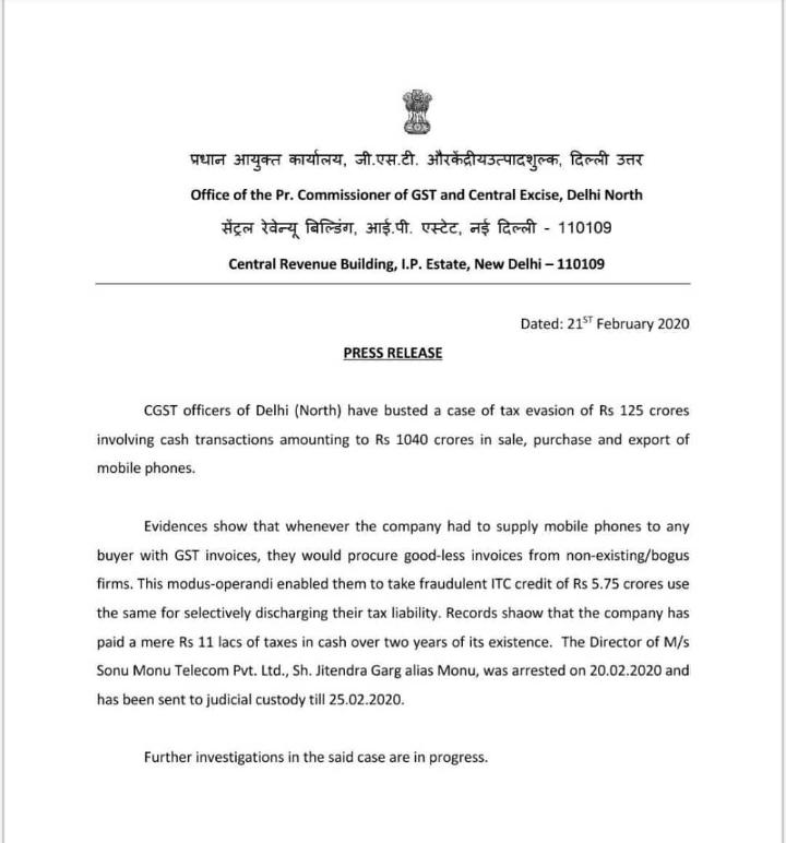 This modus-operandi enabled them to take fraudulent ITC credit of Rs 5.75 crores use the same for selectively discharging their tax liability. Records show that the company has paid a mere Rs 11 lacs of taxes in cash over two years of its existence. The Director of M/s Sonu Monu Telecom Pvt. Ltd., Sh. Jitendra Garg alias Monu, was arrested on 20.02.2020 and has been sent to judicial custody till 25.02.2020.